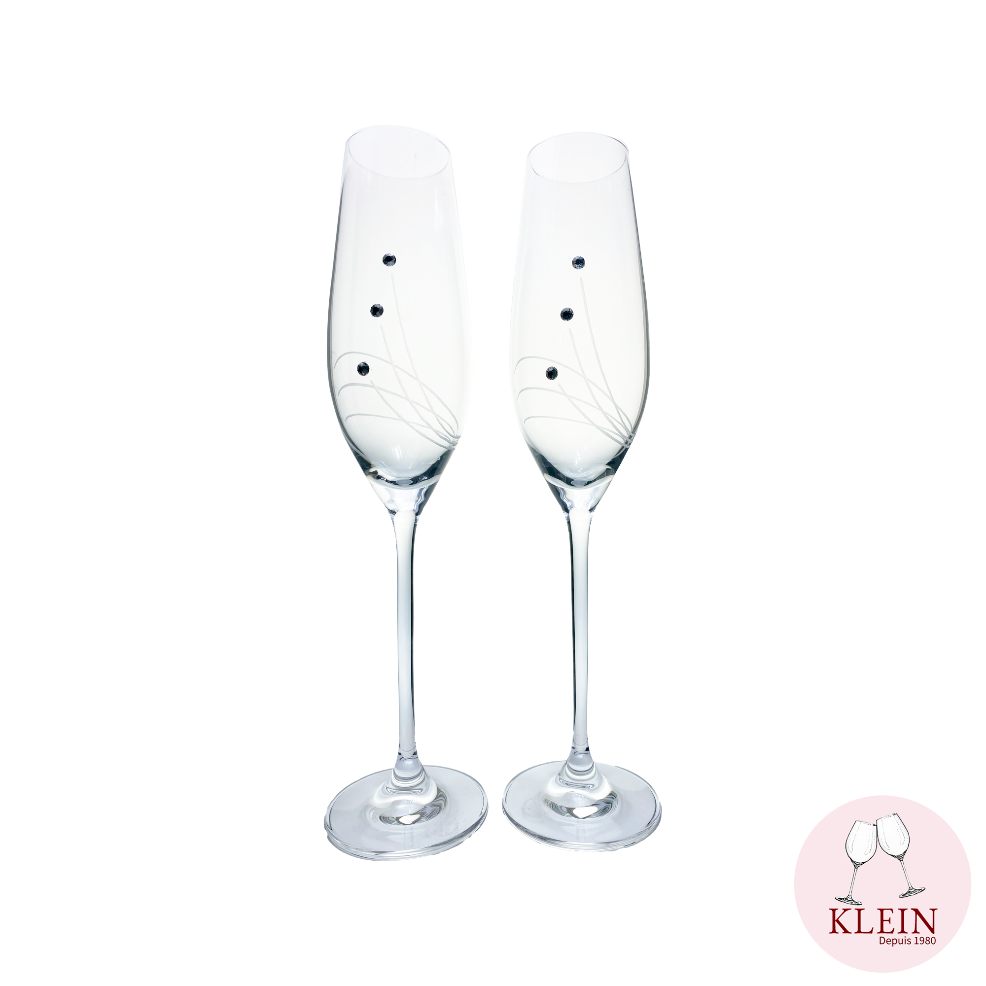Deux flûtes à champagnes avec une jambe très élancée, faites d'une seule partie pour plus de solidité. Le décor est taillé à la main et accompagné de petits pierres de cristal délicatement disposées sur le verre.