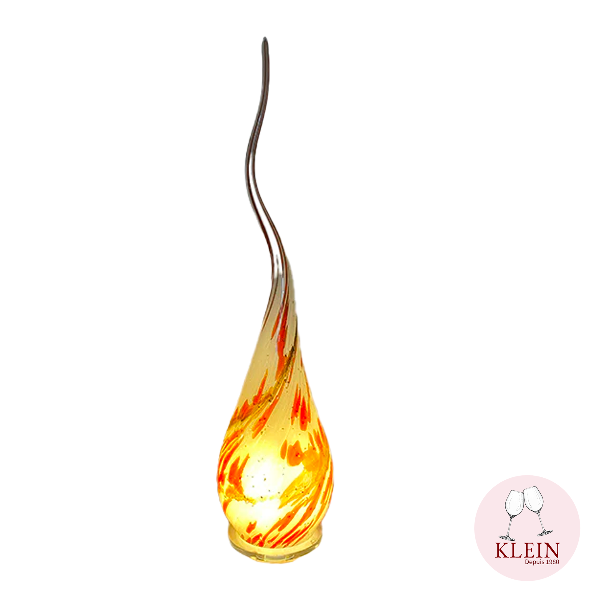 Une création de la Maison Klein Artisan du Cristal. Une lampe aux couleurs flamboyantes jaunes, orangées et argentées qui sauront sublimer votre intérieur à la perfection, aussi bien éteinte qu'allumée. Lampe en cristal soufflée bouche avec des inclusions de couleurs obtenues par l'application d'émaux vitrifiés sur socle en cristal transparent.